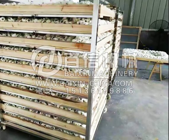 方案設(shè)計:本地原始烘法,用土烘房燒煤、燒柴進行烘干,那樣不僅量小,產(chǎn)品質(zhì)量不穩(wěn)定,而且人工成本高。現(xiàn)給客戶設(shè)計一個板房放2000斤物料,一共4個板房,采用推車式放物料,每一個板房用6個推車,每個推車34個托盤,每個托盤放10斤物料。