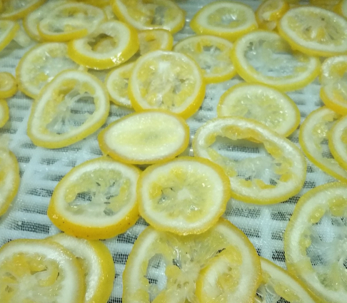 根據(jù)自身烘干要求,可把切片后的檸檬片放到糖漿浸泡一段時間,檸檬片在浸泡糖漿的時候,因為密度低的水份回流向密度高的水份,所以檸檬片的水分會流向糖漿,失去一部分水;因檸檬片經(jīng)糖漿浸泡過,檸檬片也不用烘得太干;這樣一方面就節(jié)省了烘干時間。