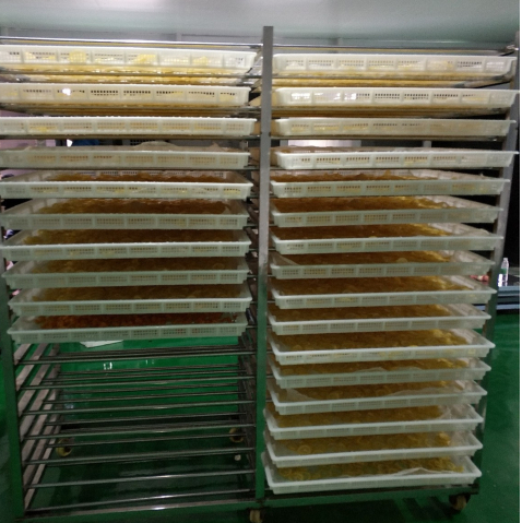 把浸泡好的檸檬片擺上托盤,注意擺放均勻,不能堆疊,放入推車,推進(jìn)烘干房內(nèi)。